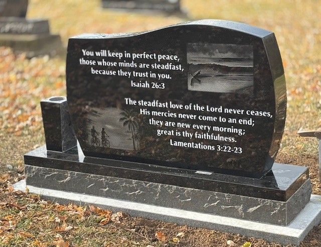 At Fuller Monument, we have in-house etching experts who can bring your thoughts to life esthetically. Image etching can transfer any portrait or scene provided by the customer to granite by etching the surface of it with diamond-tipped tools. Usually, a dark tone or smallest grain granite offers the best outcome. Our impact etching system can work on any color of granite since it also applies a diamond tip to etch directly into the monument, guaranteeing a bold and everlasting image.